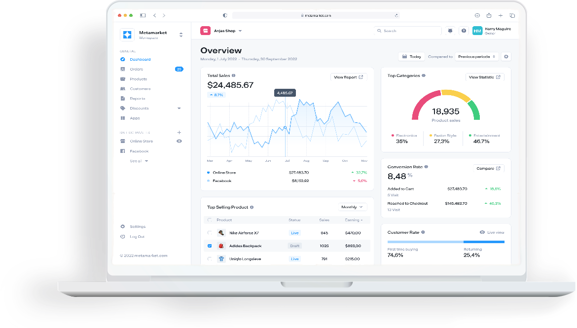 თქვენს ელექტრონულ მაღაზიას გააჩნია საკუთარი მძლავრი საკონტროლო პანელი, რომელშიც ინტეგრირებული და ჩაშენებულია დიდი რაოდენობით სამეწარემო ინსტრუმენტები და ბიზნეს ხელსაწყოები, რომლებიც საუკეთესოდ გეხმარებიან მოიპოვოთ სრული კონტროლი თქვენი ბიზნესის ყოველდღიურ საქმიანობებზე.